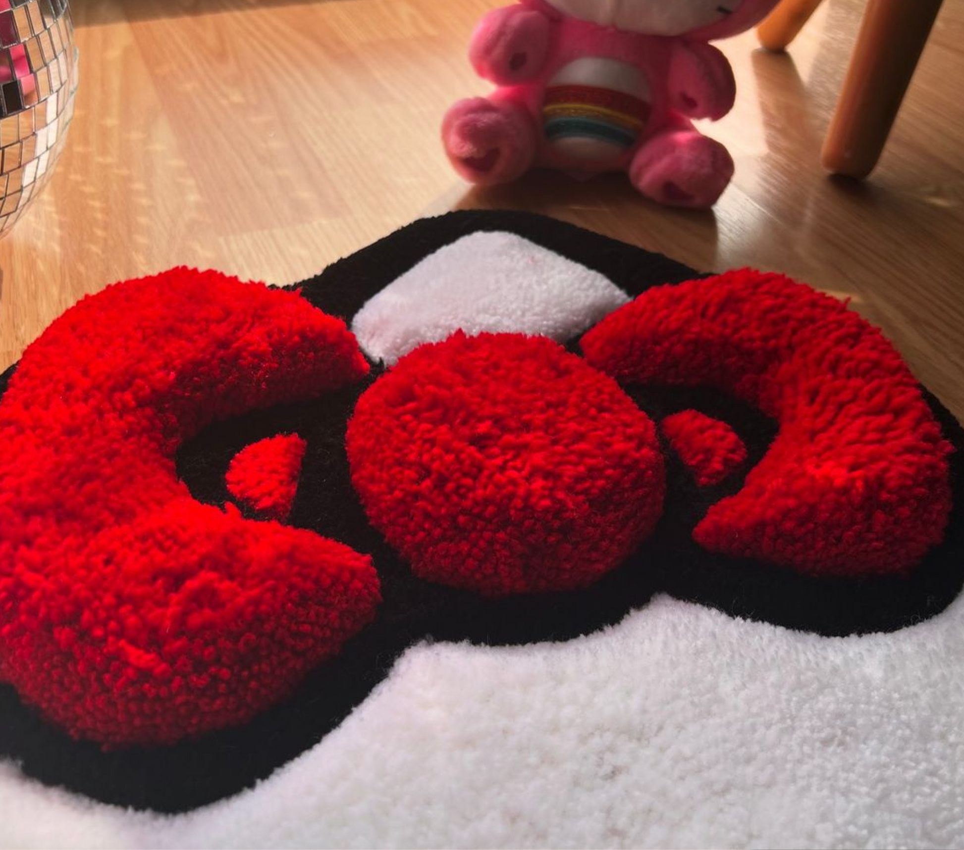 Bring some cuteness to your space with this handmade Hello Kitty tufted rug. Crafted with care using premium acrylic yarn, every detail from the iconic bow to the classic monochrome face is carefully recreated in fluffy, vibrant texture.